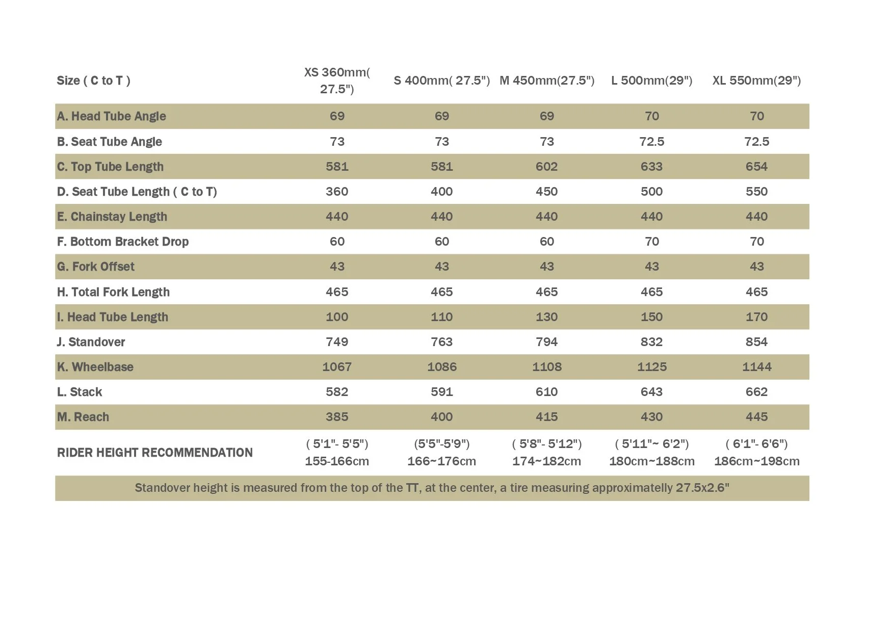 One more thing, combining a 44mm ID headtube and sufficient axle-to-crown length allows an immediate cross-country riding experience by switching the rigid fork with a suspension fork. (Check the fork suspension recommendation chart.)